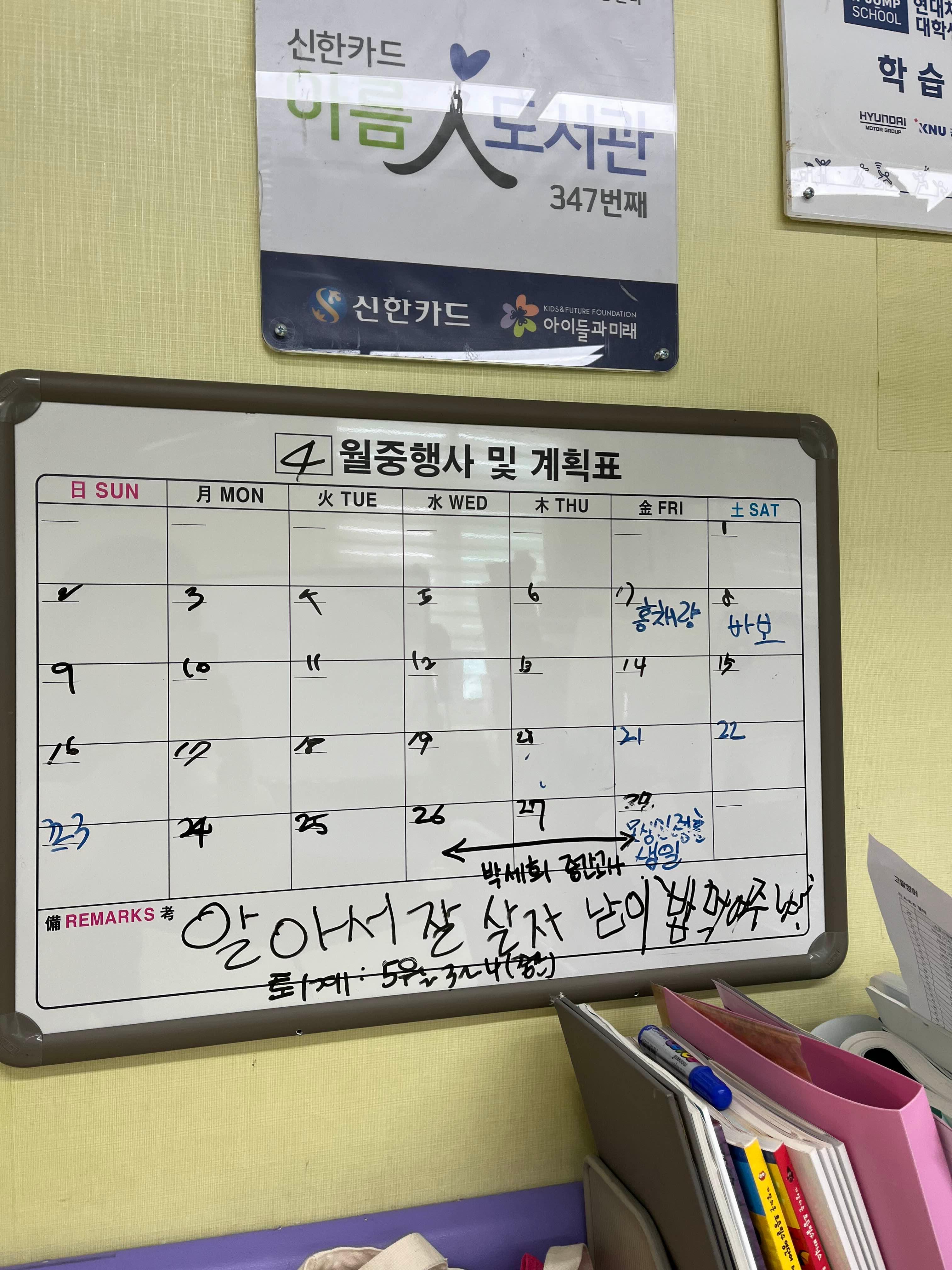 그리고 퇴근할땐 그날 하루 일지(오늘은 내가 센터에서 무엇을 했는지, 공부를 봐줬으면 어떤 과목/몇페이지를 봐줬는지 등등)를 작성해야한다.